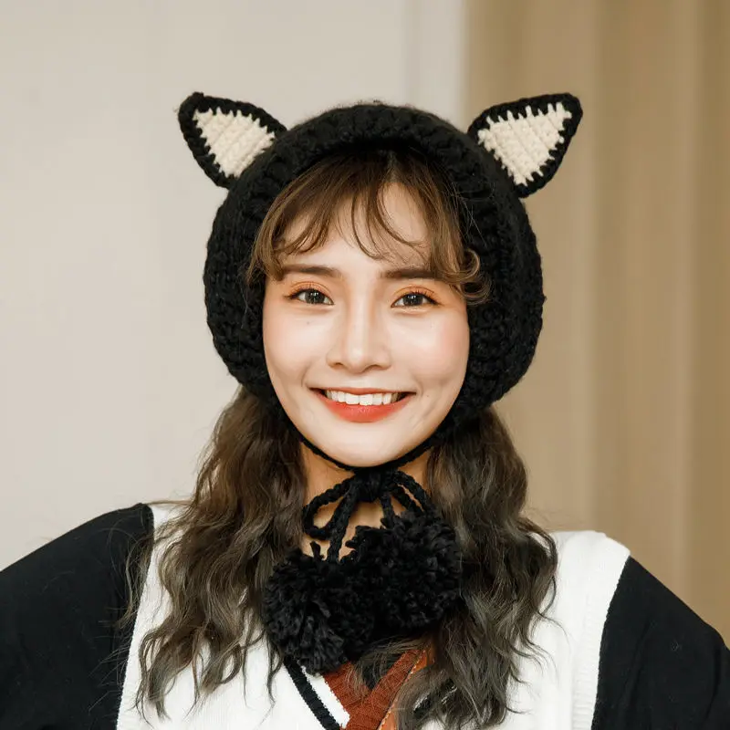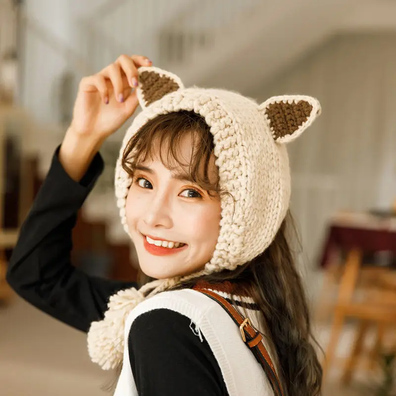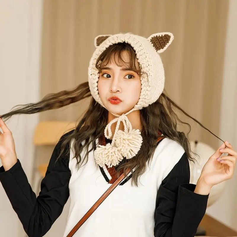 Limited Cute Animal Girl's Hat Fox Apparel Accessories Knitted Warm Cap Bonnet with Braids Orange Kawaii Sweet Caps Winter Skullies 2020