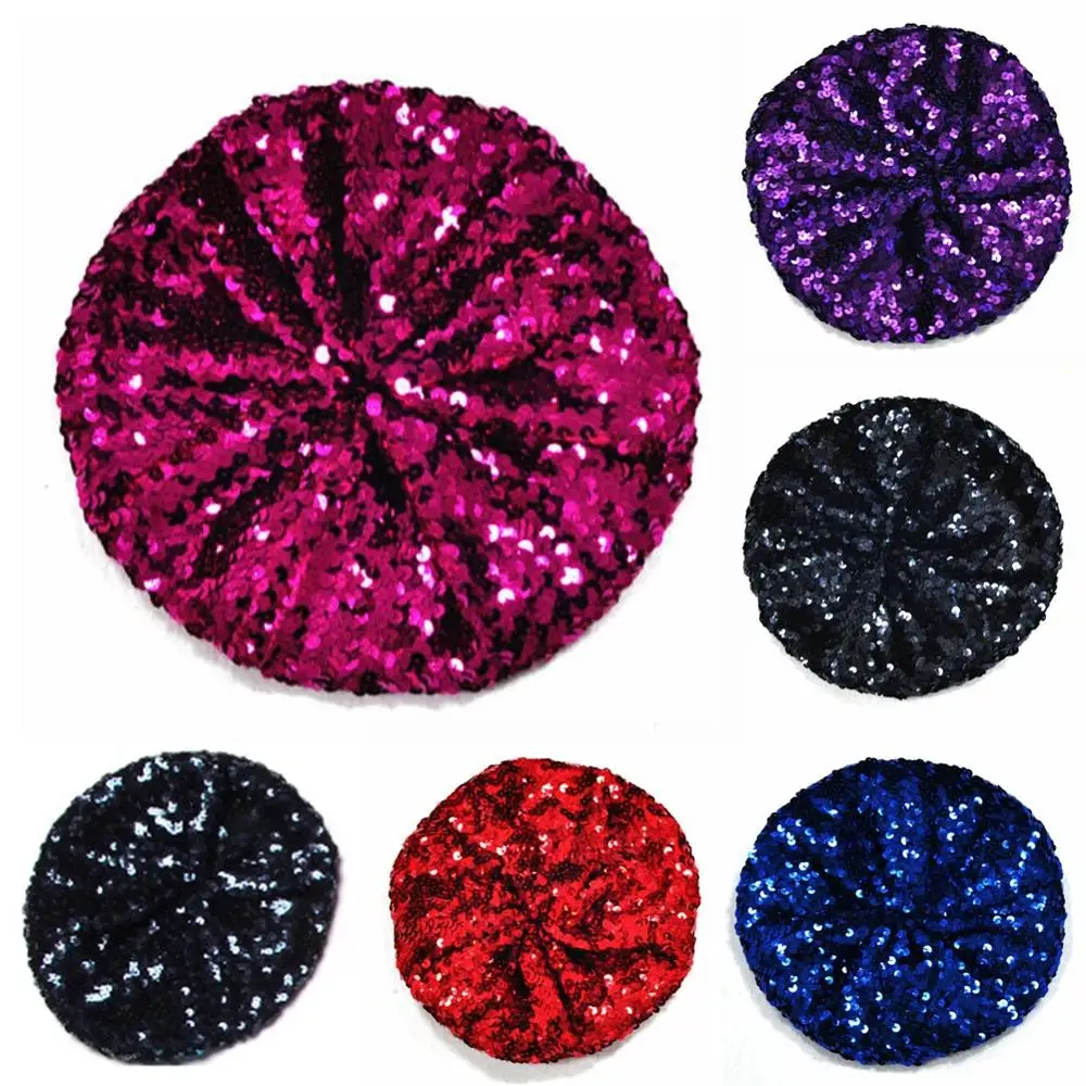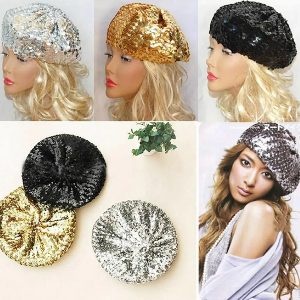 Best Price Women Sequins Hat Metallic Shining Costume Jazz Glitter Dance French Beret Round Cap Ladies Fashion Accessories Beanie